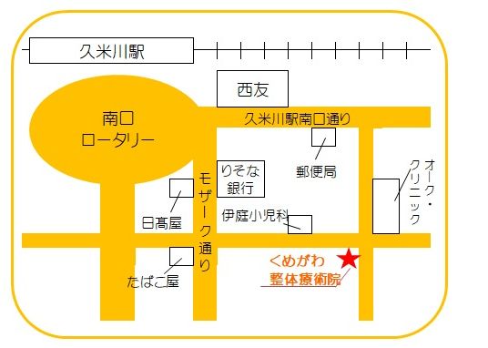 南口ロータリーから西友前の通り(久米川駅南口通り)を進み、郵便局を通り過ぎたらすぐに路地がありますので、その路地を右に曲がります(曲がり角にお惣菜屋さんがあります)。50mほど進むと、右手に見えてきます。(最初の交差点かどに位置しています) オレンジ色の看板が目印です!